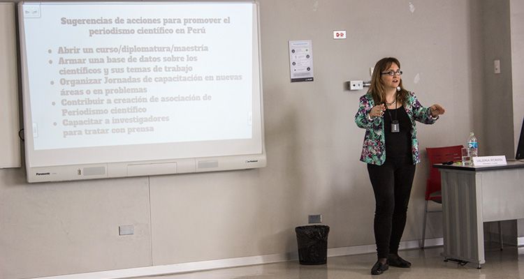 Valeria dictó dos charlas sobre periodismo científico el último miércoles 14 de setiembre. La primera estuvo dirigida a docentes, científicos y comunicadores interesados en la difusión de los hallazgos y aportes científicos que nacen en las aulas, los laboratorios y centros de investigación de la universidad.  En la segunda exposición, destinada a relatar su experiencia con estudiantes y público en general, compartió mesa con la periodista Claudia Cisneros, el investigador científico Alfredo Ibáñez y la estudiante de periodismo Paloma Verano, directora de la web Siente la Ciencia.