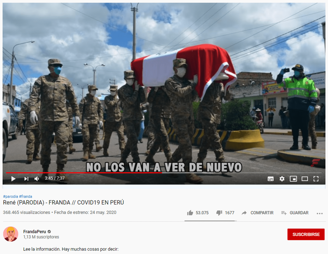 Ahora, con la parodia de René, Franda habla sobre temas de la actual coyuntura nacional, como la desobediencia a las medidas del gobierno, las desigualdades socioeconómicas del país, la falta de empatía o la labor de los médicos y militares.