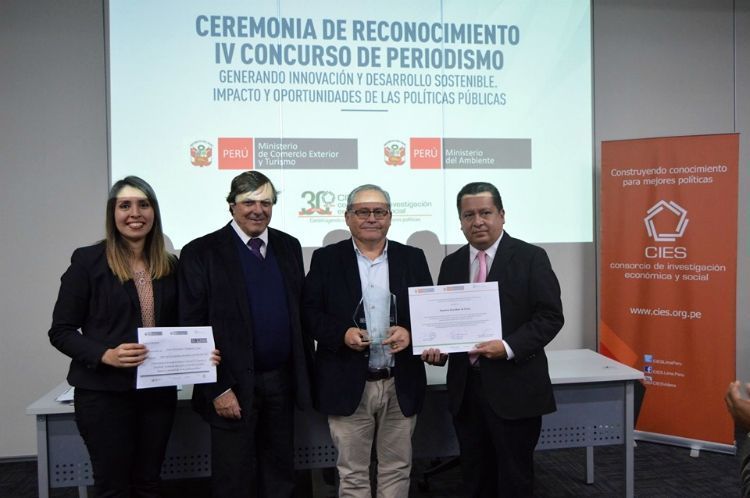 Ramiro Escobar La Cruz, profesor de la Especialidad de Periodismo de la Facultad de Ciencias y Artes de la Comunicación, obtuvo el Primer Premio en la Categoría Prensa Digital del concurso periodístico ‘Generando innovación y Desarrollo Sostenible. Impacto y Oportunidades de las Políticas Públicas’. El certamen fue organizado por el Consorcio de Investigación Económica y Social (CIES), el Ministerio del Ambiente (MINAM) y el Ministerio de Comercio Exterior y Turismo (MINCETUR), y contó con la colaboración del Colegio de Periodistas del Perú y el auspicio del International Development Research Centre (IDRC) del Canadá.
