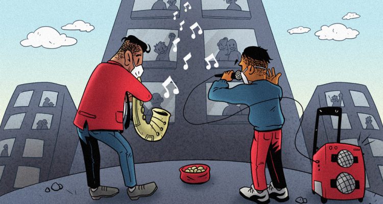 De forma intempestiva, la emergencia sanitaria dejó en el desempleo a quienes vivían de la música. De pronto, cantantes e instrumentistas no podían ofrecer conciertos. La calle se convirtió entonces en el escenario de sus presentaciones. Allí esperan que un público ocasional salga de sus casas y se anime a retribuirlos con unas monedas. Son músicos ambulantes y peregrinan por la ciudad. Para el cantante Daniel Núñez y el saxofonista Chano Morales esta experiencia ha sido todo un aprendizaje. Descubrieron qué ritmos debían tocar en cada barrio que visitaban, conocieron la generosidad de vecinos agradecidos y también tuvieron algunos desencuentros con las autoridades de fiscalización municipal.