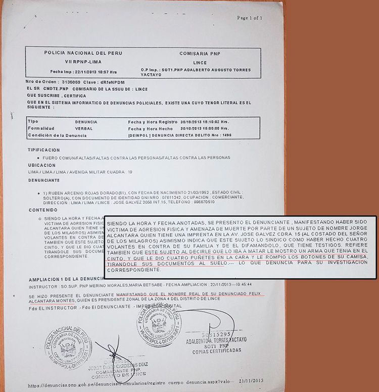 Dos años después, en 2013, Alcántara fue denunciado por Rubén Rojas, vecino del distrito, en la comisaría del distrito. Rojas asegura que Alcántara, pistola en mano, lo amenazó de muerte y le dio cuatro puñetazos en el rostro. Rojas asegura que Alcántara lo atacó porque investigaba irregularidades de la gestión de Príncipe. La denuncia, sin embargo, fue archivada. Supuestos testigos de la agresión no llegaron a dar su versión.