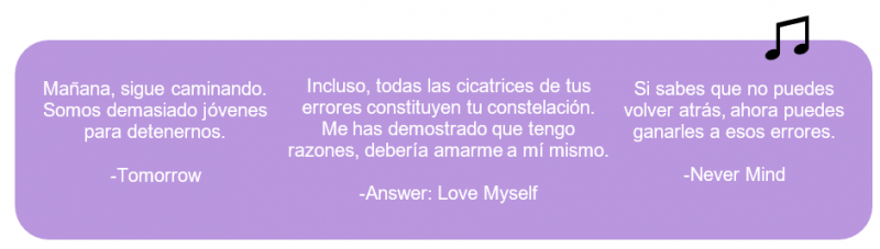 Ellos han sabido adaptar su trabajo a las distintas eras sin dejar de lado su esencia: transmitir un mensaje positivo, crítica o reclamo mediante las letras de sus canciones. Baepsae habla sobre la difícil situación de las generaciones jóvenes y cómo son estereotipadas: “En un trabajo de medio tiempo, es ‘todo por experiencia’. En la escuela, están los maestros. Mis superiores usan la violencia. En los medios de comunicación hablan sobre ‘la generación que ha renunciado’. Cambia las reglas, cámbialas”. Magic Shop trata sobre cómo BTS busca ser un lugar de felicidad y aliento para los ARMY: “Los días en los que quieras desaparecer para siempre, hagamos una puerta en tu corazón. Si abres esa puerta y entras, allí estaré, esperándote. Está bien creer, eso te dará consuelo”.