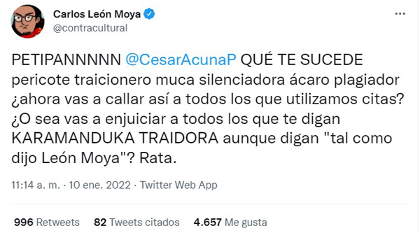 Este fragmento le sirvió de munición a Aldo Mariátegui, el nieto de José Carlos Mariátegui y odiador de comunistas, en su diatriba contra la izquierda del 23 de diciembre de 2020 en Perú 21. Allí sostuvo que Zavala “agravó su situación al convocar a estos mercenarios izquierdistas” porque “le vendieron un libreto ajeno a la filosofía ppkausa, eran un trapo rojo frente al toro congresal naranja”. Líneas más abajo elogió al protagonista de esta nota: “León Moya es el mejor de ellos escribiendo y analizando”.