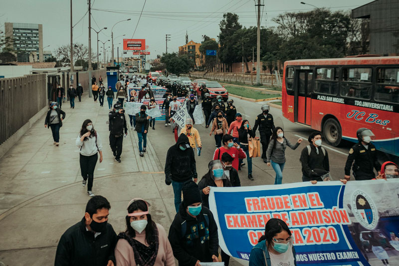 Los estudiantes sanmarquinos realizaron una protesta en la avenida Universitaria en contra del examen virtual de admisión que se realizó el 2 y 3 de octubre. Los estudiantes denunciaron la falta de empatía de las autoridades por aprobar un examen que no tomaba en cuenta las condiciones de todos los postulantes.