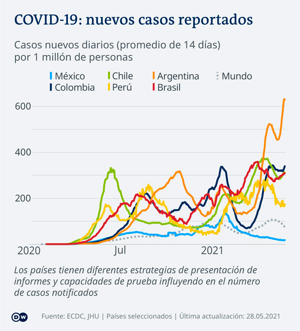 Gráfica de casos confirmados en algunos países de la región. Argentina está en su pico más alto. Foto: Deutsche Welle