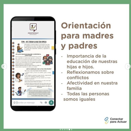 “Me gusta ProfeChat porque nos permite atención a cualquier hora del día, refuerza las actividades que nos brindan nuestros docentes, no se necesita de una mayor conexión y es fácil de utilizar”, cuenta un joven en uno de los videos publicados por Conectar Para Actuar en su cuenta de Instagram. Se trata de Edeimin, estudiante de secundaria de la provincia de Ayabaca (Piura), para quien ProfeChat se ha convertido en una alternativa de estudio en una región en la que más de 20 000 escolares de zonas rurales no pueden acceder a sus clases virtuales debido a la escasa señal de internet.