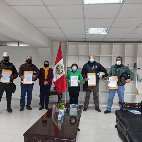 Reunión de repartidores con la congresista Susel Paredes para la redacción del Proyecto de Ley N° 018-2021-CR. Alfredo y Alejandra Dinegro, segundo y tercera de izquierda a derecha. Foto: Instagram Observatorio Plataformas Perú.