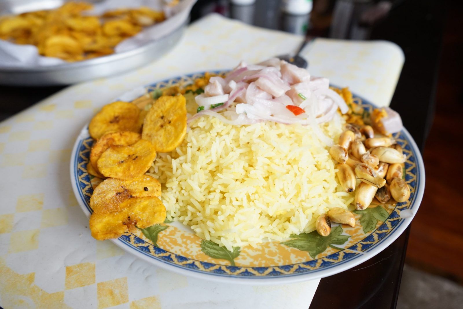 Si estamos en Tumbes, sería casi un sacrilegio no añadir algunos de los productos que allá se cosechan como guarnición. Estos acompañamientos sí son a elección y escapan de la estructura mínima básica del mixto. Estas dependen de la carretilla en la que nos sentemos. Los más comunes son la cancha serrana (de maíz chulpi, claro está), la zarandaja, el camote, la yuca, el choclo o chifles. Puedes elegir uno, dos o todos a la vez, pero las estrellas de este plato serán siempre el trío de arroz amarillo, ceviche de pescado y tollo desmenuzado.