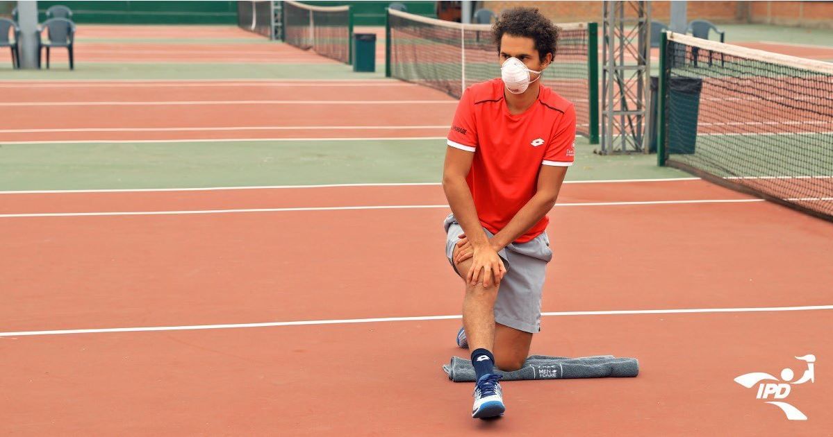 Juan Pablo Varillas, la raqueta número uno del Perú, realizando ejercicios de desentumecimiento de piernas con la mascarilla puesta. Desde hace tres semanas, la selección peruana de tenis viene entrenando en Campo de Marte con miras a su partido contra Bosnia. FOTO: IPD.