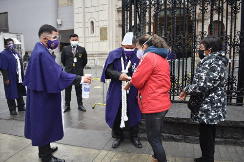 De las andas, pasaron a la guardia. Las cuadrillas se turnaron para vigilar y cuidar que los creyentes, al asistir a contemplar la imagen del Señor de los Milagros, cumplan con las medidas de bioseguridad.