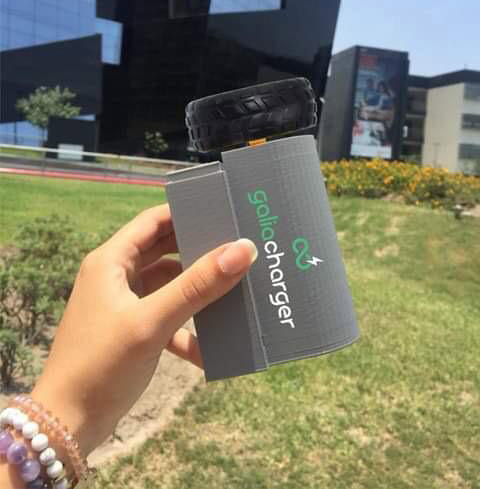 Galia Charger es una empresa que busca renovar e innovar la manera de captar energía. Su primer producto es un cargador de batería creado por cuatro estudiantes de Ingeniería Industrial de la Universidad de Lima. Este artefacto busca transformar la energía cinética o de movimiento en energía eléctrica. Para que funcione el dispositivo se debe colocar en cualquier equipo que requiere movimientos rotatorios, como una bicicleta, una caminadora, una silla de ruedas, entre otros. Valeria Boner, una de las integrantes de Galia Charger, explica que el cargador funciona de la siguiente manera: “El producto tiene dos partes: la del generador y la batería, ambas van juntas en la bicicleta. Nuestro aparato tiene una pequeña rueda, y cuando la bicicleta gira, la rueda del aparato también. Ese movimiento genera energía que luego se convierte en eléctrica”, explica.