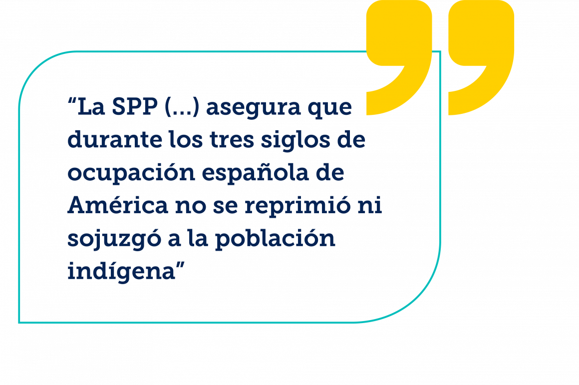 La Sociedad de Patriotas del Perú también asegura que durante los tres siglos de ocupación española de América no se reprimió ni sojuzgó a la población indígena.