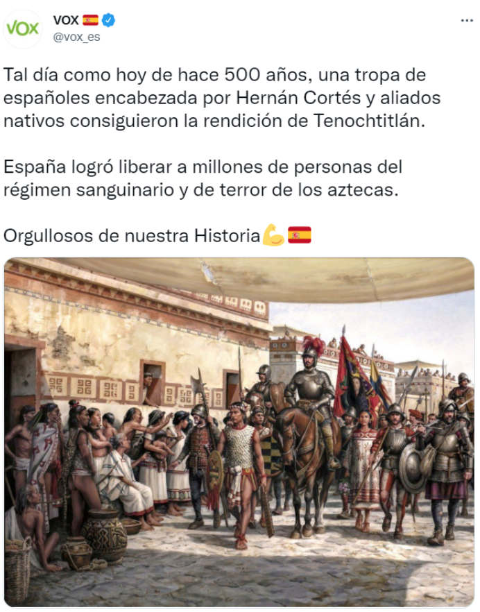El pasado 13 de agosto, aniversario de los 500 años de la caída de Tenochtitlan, la cuenta de Twitter de Vox, partido político español de extrema derecha, publicó un mensaje que decía “España logró liberar a millones de personas del régimen sanguinario y de terror de los aztecas. Orgullosos de nuestra Historia”.