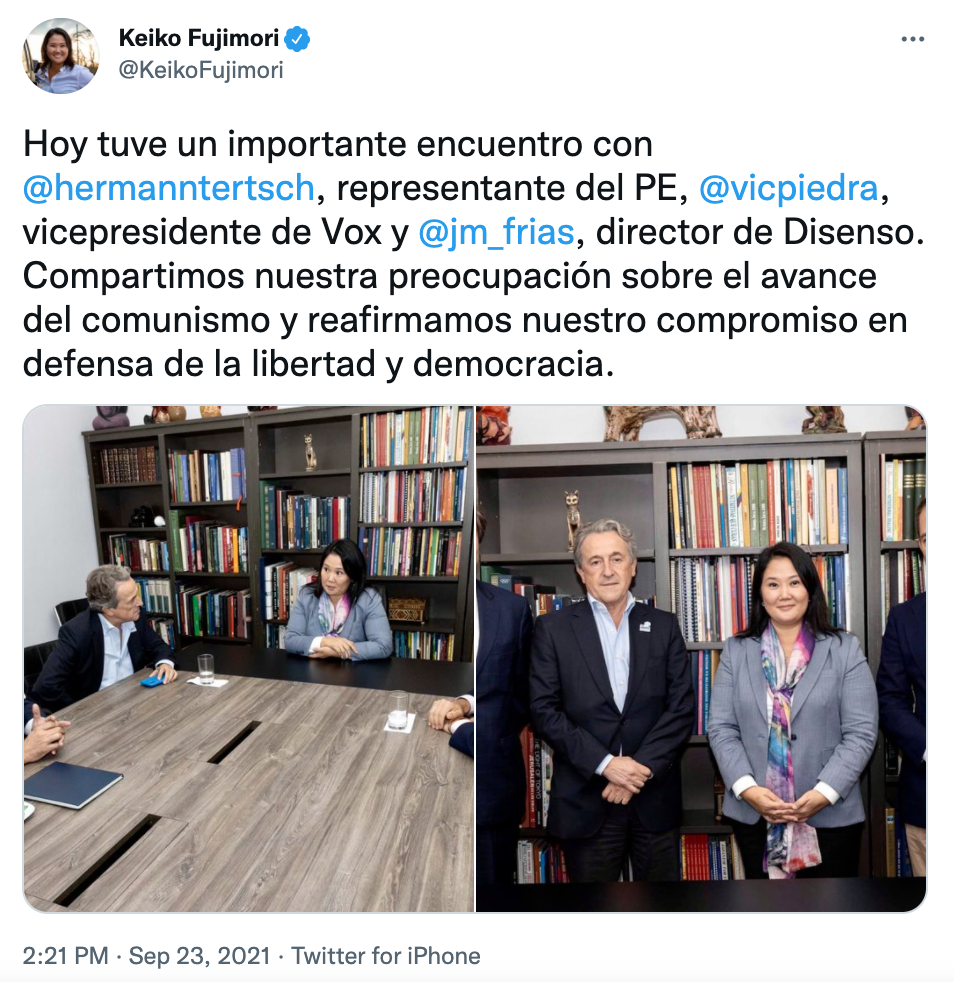 “El evento, estoy segura, será un referente para la Hispanidad de lo que realmente significa patria y ser patriota, de democracia y ser demócrata, de libertad y ser real defensor de la misma, pero estoy convencida que Viva 21 es un símbolo de la unidad hispana frente a la amenaza del llamado socialismo del siglo XXI. Esa corriente nefasta empobrecedora y enemiga del desarrollo que ha envenenado por décadas a nuestros jóvenes y tergiversado nuestra real historia. Muchas gracias a Vox, cuentan con Fuerza Popular. ¡Viva España! ¡Viva el Perú!”, expresó entonces la lideresa del partido naranja.
