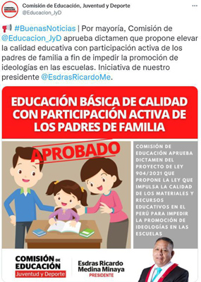 A pesar de este panorama, desde hace unos años, en la sociedad peruana se vienen gestando y promoviendo iniciativas para que las niñas, niños y adolescentes tengan acceso a una Educación Sexual Integral (ESI). Dos de ellas son «Emma y yo» y el «Centro Juvenil Futuro», quienes se pronunciaron en contra de un dictamen que aprobó el 18 de enero la Comisión de Educación del Congreso, con el que buscan quitarle facultades al Minedu en los materiales sobre Educación Sexual y Enfoque de Género.