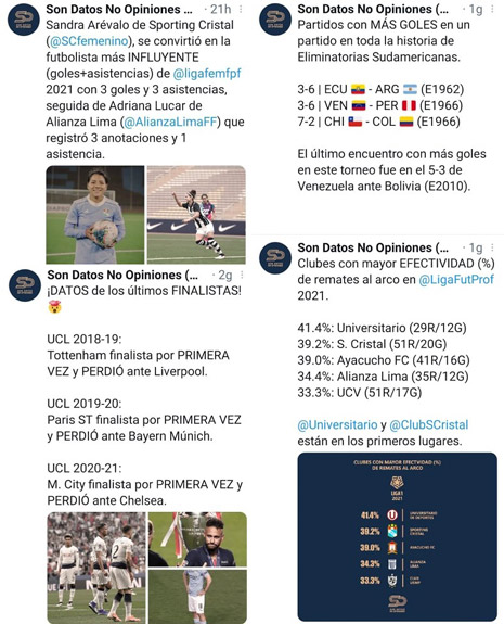 En el fútbol, detrás de cada penal, de cada tarjeta roja o de cada doblete, existe un número al lado; detrás de cada grito de aliento hay una marca estadística que aguarda por ser superada, una comparación que se integra a un amplio historial de los récords memorables. Jesús Chirinos jamás pensó que con Son Datos No Opiniones (SDNO), un medio propio, con cuentas en Facebook, Twitter, Instagram y página web, cuyo contenido es estadística pura e irrefutable del fútbol peruano e internacional, lograría posicionarse como un referente del periodismo deportivo.