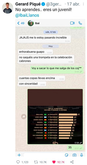 Se dice que el número siete es el símbolo de la perfección y de la buena suerte: 17 de abril a las 17:57 p.m. de este año. Muchos sietes en una sola fecha y hora. Este registro temporal le pertenece a un tweet publicado por Gerard Piqué, futbolista español de 34 años que ese día había campeonado la Copa del Rey con el Barza, su equipo de toda la vida. Piqué hizo pública una amena y confusa conversación vía Twitter. Él se encontraba en plena celebración y, de pronto, el streamer Ibai Llanos, su compatriota y también amigo, fiel a su estilo sarcástico, le escribió el respectivo mensaje de felicitación: “Enhorabuena guapo, no saquéis la trompeta en la celebración, cabrones”, le dijo. El central azulgrana, nada discreto, le contestó: “Voy a sacar lo que me salga de los coj**”. Se intuía el tono bromista que llevaba esa charla online. Llanos replicó con una pregunta algo ambigua: “¿Cuántas copas llevas encima, con sinceridad?”, refiriéndose a las copas de vino que se había echado encima después del triunfo. El futbolista supo evadir la interrogante con una respuesta estratégica: aludir a sus trofeos ganados en las canchas de fútbol. Le contestó con una imagen que indicaba todos los títulos que había obtenido en sus 17 temporadas de trayectoria deportiva, que incluso lo colocaba en el Top 10 histórico. El formato de la imagen enviada era detallado, contaba con unas barras que facilitaban la lectura veloz. Las dimensiones, el color y la fuente eran fáciles de reconocer, especialmente por el logo que adornaba la parte inferior. Bajo todas esas evidencias, existía una única respuesta: la fuente de la ilustración usada orgullosamente por el azulgrana era la página Son Datos No Opiniones, administrada por el peruano Jesús Chirinos. Hasta el día de hoy, Jesús no se explica cómo la imagen colgada en sus redes sociales llegó a las manos -o más bien al celular- de Gerard Piqué, quien posteriormente la difundió entre sus más de 19 millones de seguidores mediante un tweet.