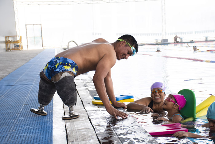 Antes de la pandemia, Juancito era voluntario en la piscina de la Municipalidad de Bellavista, enseñaba a niños y adultos con discapacidad. Todos los martes, a las tres de la tarde, llegaba a este coliseo junto a su novia Lindsay, a quien conoció en su terapia física en agosto del año 2016, para entrenar a casi 50 personas en una piscina olímpica. Los niños lo admiran. Saben que Juancito es una persona con una vida llena de experiencias marcadas por la resiliencia y lo ven como un modelo a seguir.