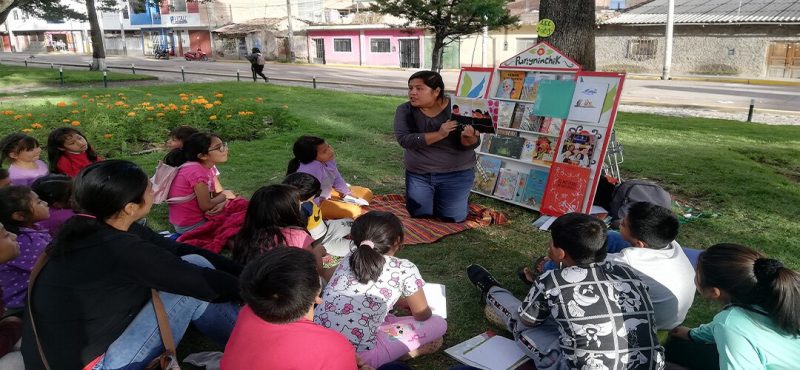 Las “bibliotecas caminantes” es otro de los proyectos de la Asociación Puriyninchik. Los libros se trasladan a espacios de lectura, creados en parques, iglesias y municipios, que se instalan en las ciudades de Huamanga, Huanta y Sarhua.