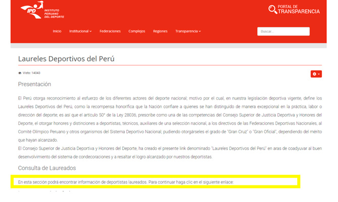 Sin embargo, esto no se ve reflejado en la página del Instituto Peruano del Deporte (IPD). Actualmente, la Consulta de Laureados, sección dedicada a recordar los logros de los deportistas condecorados desde 1952 hasta la fecha, se encuentra deshabilitada. Esto refuerza que la ciudadanía no tenga acceso a la información sobre los logros deportivos emblemáticos del Perú. El homenaje a nuestros héroes pasa desapercibido.