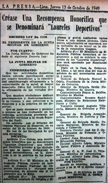 En 1949, el presidente Manuel A. Odría estableció la recompensa honorífica denominada Laureles Deportivos a través del Decreto Ley N° 11193. Este reconocimiento surgió para dar impulso al deporte en el país. En aquel entonces, era entregado por el Ministerio de Educación a propuesta del Consejo Nacional del Deporte (hoy IPD). Actualmente, se encuentra definido en la Ley de Promoción y Desarrollo del Deporte (Ley 28036) dado por Decreto Supremo durante el gobierno de Alejandro Toledo en 2004.