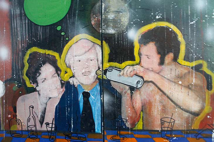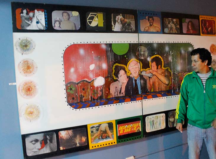 “Lucho es muy importante para mí”, afirma el artista egresado de la ENSABAP y profesor de Historia del Arte en Cibertec. Su taller, ubicado en el segundo piso de una casa cercana al paradero Venus de la avenida Brasil, resulta un espacio insospechado. Lucho atraviesa toda la larga habitación que conforma el taller. Lo primero que salta a la vista es un enorme cuadro que ocupaba gran parte de una de las paredes, díptico en el que vemos al centro a Andy Warhol, flanqueado por Betty Adler y Lucho en la posición de la clásica fotografía en la que le da el biberón a su sobrina Techi. El trío está rodeado de imágenes pop de los años ’70, alusivas al famoso Estudio 54; o fotos personales, de Domenack de niño, sus padres de jóvenes, sus dibujos animados de la infancia, entre otros. En la otra pared, al fondo, Betty y Lucho manejaban el Volvo felices, con un fondo cromático perfecto. Una fotografía del vate enmarcada, pequeña, junto a otra de sus padres, como si se tratase de un tío suyo, o del abuelo de joven. Se siente en los cuadros de Domenack sobre Lucho un deseo de tornarlo más familiar, de hacerlo suyo.