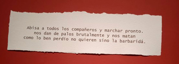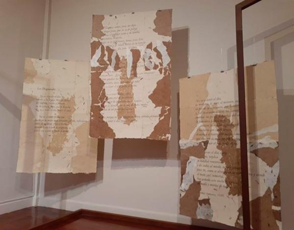 4. Lo orgánico: La exposición exhibe gigantografías con poemas emblemáticos. Algunos versos tienen manchas y están atravesados por estructuras de apariencia metálica que dificultan la lectura al visitante. El uso de estos elementos es deliberado y estuvo a cargo de la artista Liliana Melchor, quien elaboró el material con fibra de palmera, choclo, plátano y piña. Estas representaciones están relacionadas con las constantes alusiones que el poeta hace del cuerpo humano. El poema “Los desgraciados” (1939) es un claro ejemplo de ello.