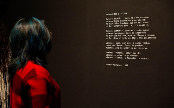 6. Sonido: Sucasaca y Hualpa Benavides resaltan otro de los espacios de la exposición: la representación sonora, oral del poema “Intensidad y altura”, del libro póstumo “Poemas humanos” (1939). Este poema fue escogido por el músico y compositor César Bolaños, quien hizo una interpretación sonora de los versos en 1964. Bolaños buscó transmitir la sensación de querer decir algo y no poder hacerlo, indica la investigadora. La interpretación está acompañada de sonidos, murmullos, la relación compleja con el lenguaje, la búsqueda de la palabra que condense lo que se anhela decir.