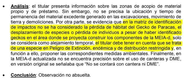 El SENACE también señaló que el impacto de las posibles actividades mineras en el ecosistema de la zona no ha sido correctamente evaluado por la empresa Terminal Portuario Paracas. Un ejemplo de ello es que no se incluyeron medidas para proteger el hábitat del gecko, un reptil en peligro de extinción que además es una especie endémica de la zona.