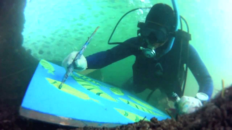 -Utilizo una pintura especial, con óleo, es decir, contiene aceite, y es imposible que se mezcle con el agua del mar. Es por eso que la pintura no se diluye. Además, este tipo de pintura no contamina el océano.