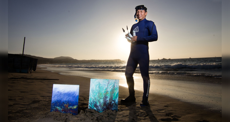 -Por el amor al mar, yo he nacido y crecido frente al mar. Mi padre también fue buzo submarino y me transmitió ese respeto por el mar desde muy pequeño. Pero él no quería que yo siguiera sus pasos porque el mar tiene sus riesgos. No te miento al decirte que estar en el mar es hermoso, pero también debo aceptar que es una experiencia temeraria. Cuando inicié este proyecto de pintar bajo el mar, decidí tomar un curso de buceo submarino. También lo llevaron la productora Denisse Sotomayor y otros dos colaboradores, quienes me apoyaron en este proyecto. Hicimos el curso para saber dónde nos metíamos y contar con la certificación que nos ha permitido desarrollar este maravilloso proyecto.