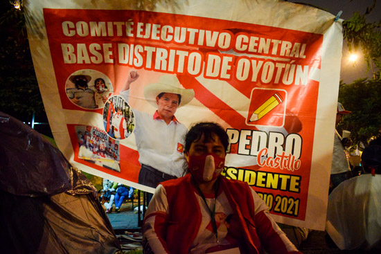 A poco más de 10 cuadras del mitin de Fuerza Popular, Doralisa Carranza (42) acampa frente al JNE junto con otros 60 maestros que han viajado desde Lambayeque para esperar la proclamación de Pedro Castillo. “Nosotros venimos para defender el voto popular”, asegura Carranza. Desde la tercera semana de junio, viven en las afueras del JNE, realizan ollas comunes para alimentarse y continúan dictando sus clases de manera virtual.