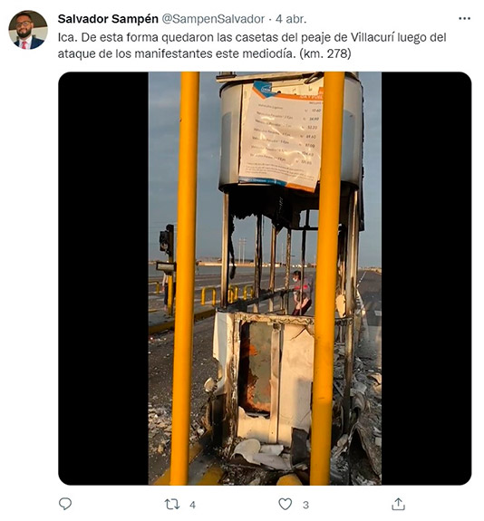“La policía no podía solucionar el problema. Ellos eran cuarenta y los manifestantes, quinientos. Habían tomado a cuatro policías como rehenes y estuvieron a punto de incendiar la comisaría de Villacuri, cerca al peaje que incendiaron el 4 de abril. Parecía el fin del mundo”, recuerda Salvador.