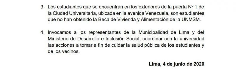 El 4 de junio las autoridades de San Marcos emitieron un último comunicado donde mencionaban indirectamente a los residentes externos e invocaban a la Municipalidad de Lima y al Ministerio de Desarrollo e Inclusión Social a “coordinar acciones con la universidad” para cuidar la salud pública de los estudiantes. Mientras tanto, los residentes externos aún esperan respuesta a sus demandas.