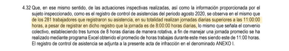 En la orden de inspección 1204-2020 SUNAFIL/IRE-ICA, de agosto de 2020, se dejó  constancia que los 281 trabajadores que registraron su asistencia realizaban jornadas laborales que superaban las 11 horas diarias.
