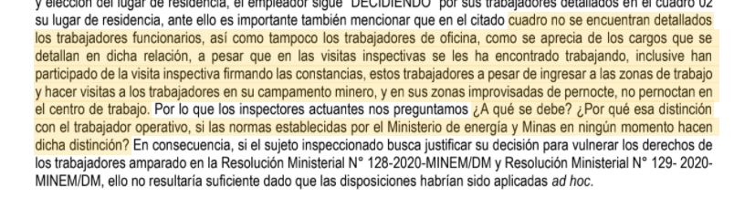 Nelly Ledesma, abogada y asesora del Sindicato de Obreros Mineros, señaló que esta situación contraviene el artículo 2 del convenio 1° de la Organización Internacional del Trabajo (OIT) y el artículo 25 de la Constitución Política del Perú. Ambas normativas determinan que la jornada laboral no puede exceder las 8 horas diarias y 48 horas semanales.