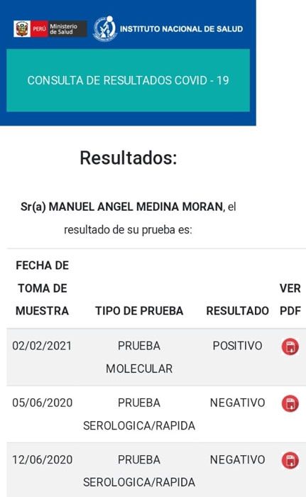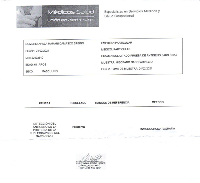 El médico ocupacional de la empresa le indicó a Damaso Apaza que tenía bronquitis y le recetó analgésicos. Pero el dolor corporal persistía. El 2 de febrero, y por insistencia de su hija, decidió bajar a la ciudad para hacerse la prueba antígena. Antes de salir del campamento minero, fue obligado a firmar una declaración jurada que aseguraba que no presentó síntomas de Covid-19 durante su estancia en el asiento minero.
