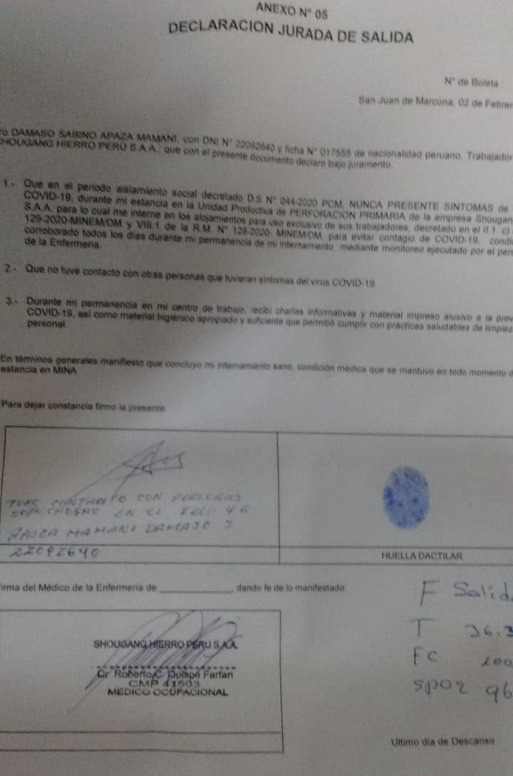 Lo mismo sucedió con Manuel Medina Morán, un ayudante de mecánica, de 39 años. Luego de una semana afectado por ataques de tos y malestar general, decidió bajar a Marcona la primera semana de enero. Antes de retirarse, el personal de la empresa lo obligó a firmar la misma declaración jurada que le mostraron a Damaso Apaza.