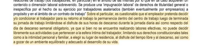 Esta clase de confinamiento laboral viola el derecho constitucional de los trabajadores a elegir su lugar de residencia, a la intimidad personal y familiar, a disfrutar su tiempo libre y gozar de un ambiente libre y equilibrado,indica la orden de inspección 1204-2020.