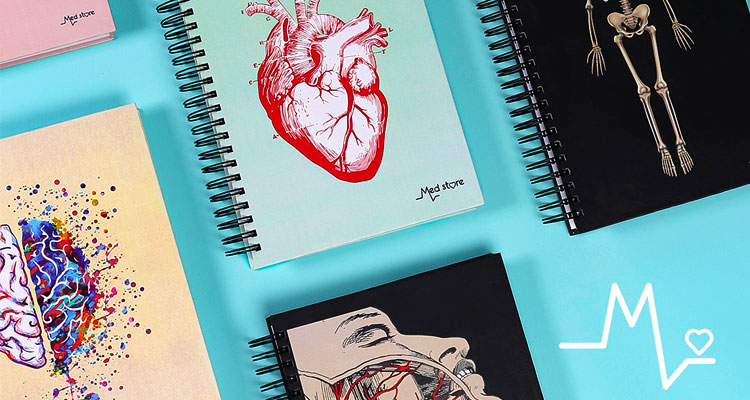 Los cuadernos anillados son de diferentes tamaños: A6, A5 y A4. Y lucen llamativos dibujos de esqueletos, corazones o cerebros inspirados en textos académicos de Medicina. Cada cuaderno cuenta con un horario de clases y dos hojas con stickers desplegables. Los más pequeños son los más prácticos de usar, ya que, por su tamaño, se pueden guardar en el bolsillo de la bata que utiliza el médico o estudiante.