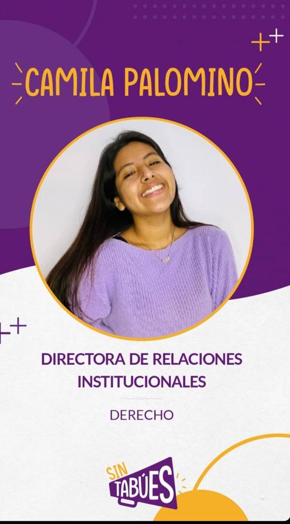 Camila Palomino, estudiante de Derecho de la PUCP y directora de relaciones institucionales de Sin Tabúes, cuenta que el proyecto nació cuando se percataron de que la violencia de género era una problemática cada vez más extendida en el país. “Por eso nos planteamos: ¿Qué podemos hacer como estudiantes para combatir este problema? Parte de la Responsabilidad Social Universitaria implica analizar la importancia que tenemos como agentes de cambio en la sociedad. El proyecto nació de la indignación, frustración e impotencia de ver que estos casos no parecían importarle a un Estado que está en la obligación de proteger a las mujeres. Queríamos concientizar sobre el tema a las nuevas generaciones”, sostiene Camila.
